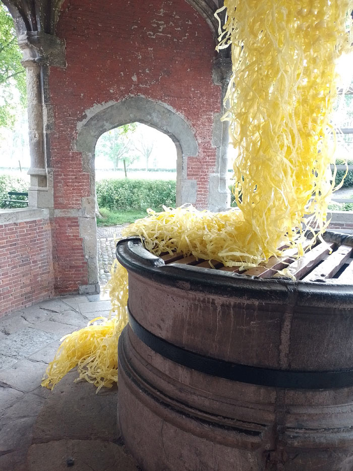In Yellow Waterfall, an intertwined mass of yellow polyethylene shavings cascades from the ceiling of a centuries-old stone well. The contrast between old and new, organic and synthetic, silence and noise, is electric. The plastic—something we usually associate with pollution or excess—becomes joyful, even majestic. It spills down into the circular basin like water might have once done, but instead of a life-giving liquid, we get a torrent of what the modern world discards.